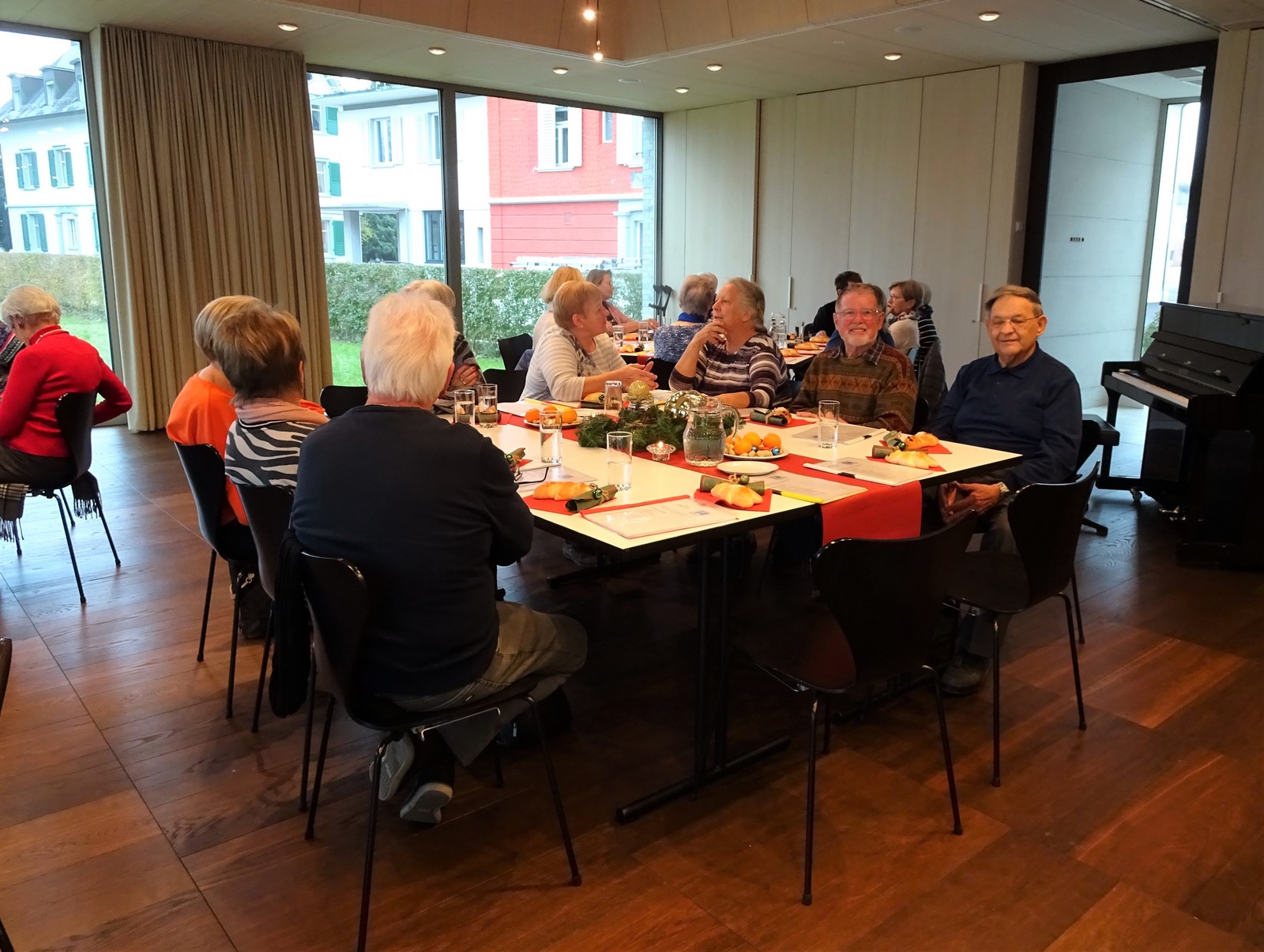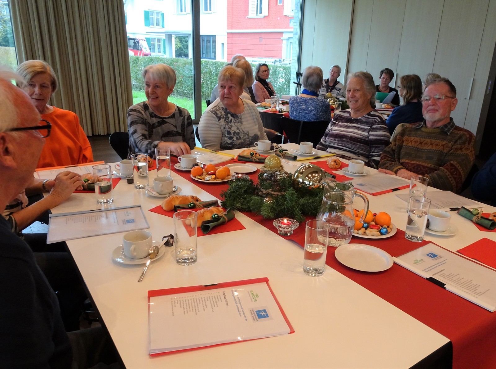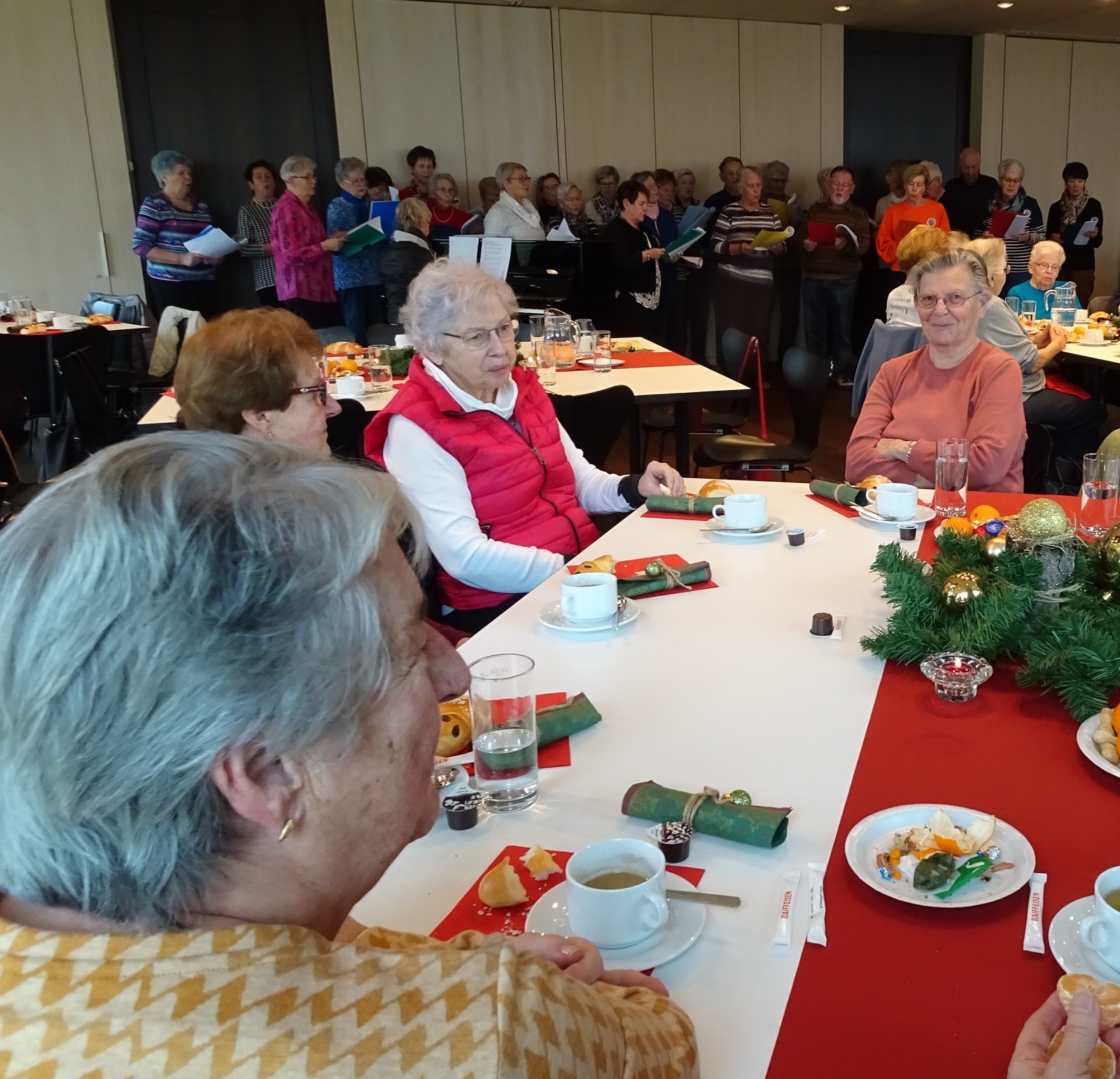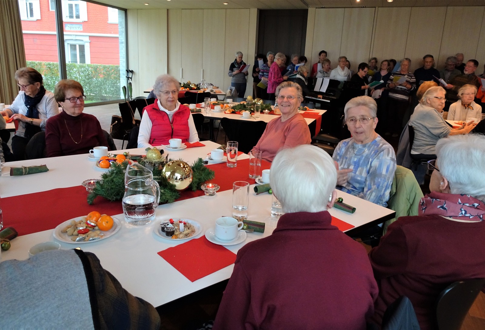 Die dekorierten Tische mit Kerzenschein, Nüssli, Schöggeli, Mandarinen und Grittibänzen strahlten adventliche Stimmung aus. Ebenso die wunderschönen Einlagen der Senior-Singers. Weihnachtslieder, aber auch bekannte, fröhliche Volkslieder wurden vorgetragen und luden die Gäste zum Mitsingen ein. Ein wohltuendes, vorweihnachtliches Zusammensein!