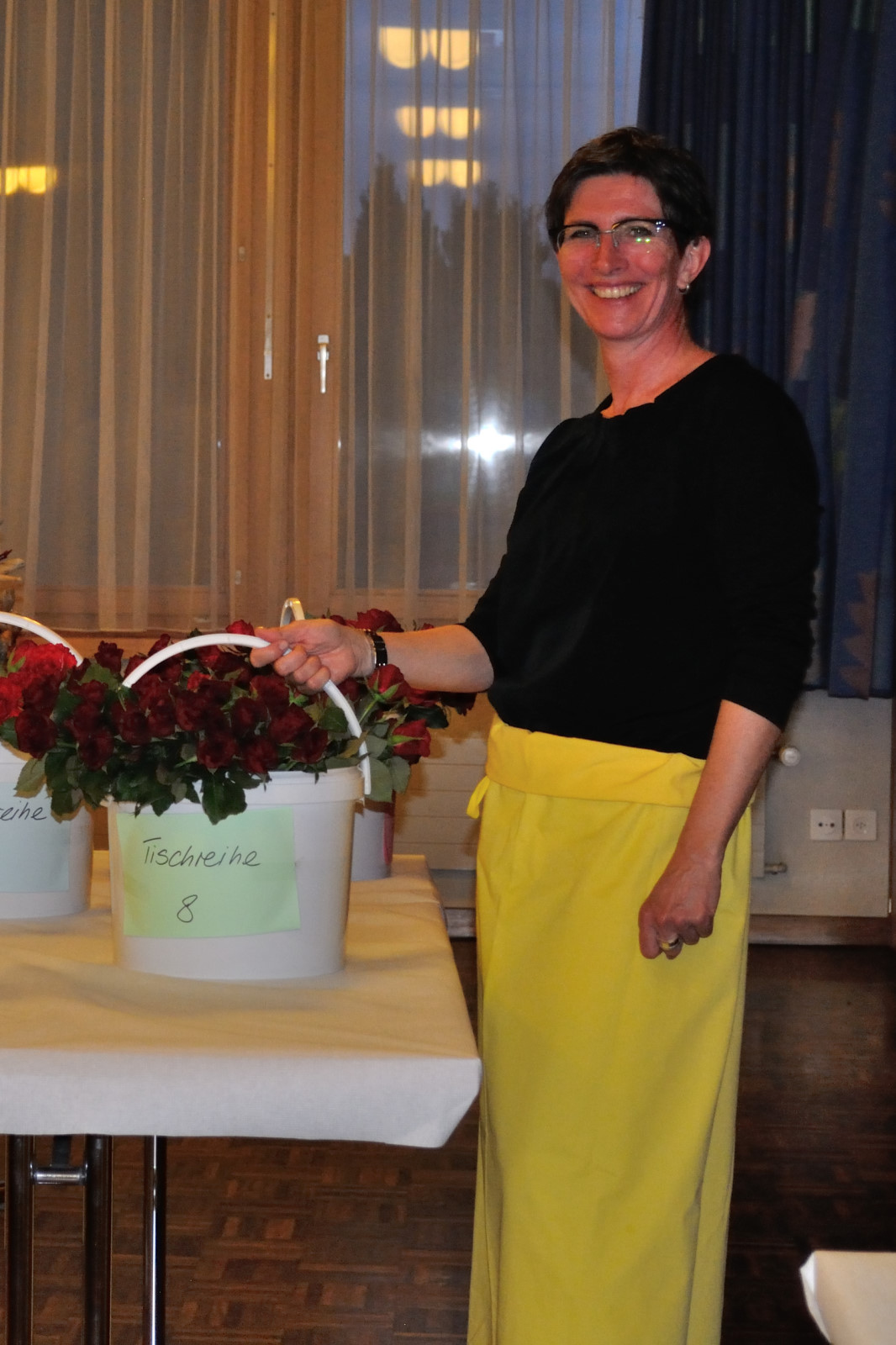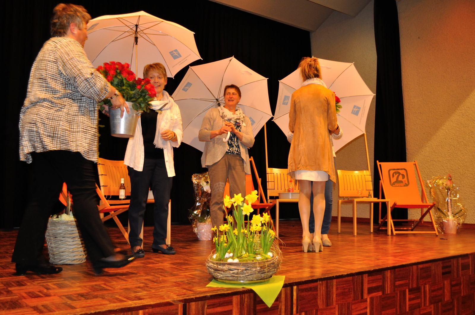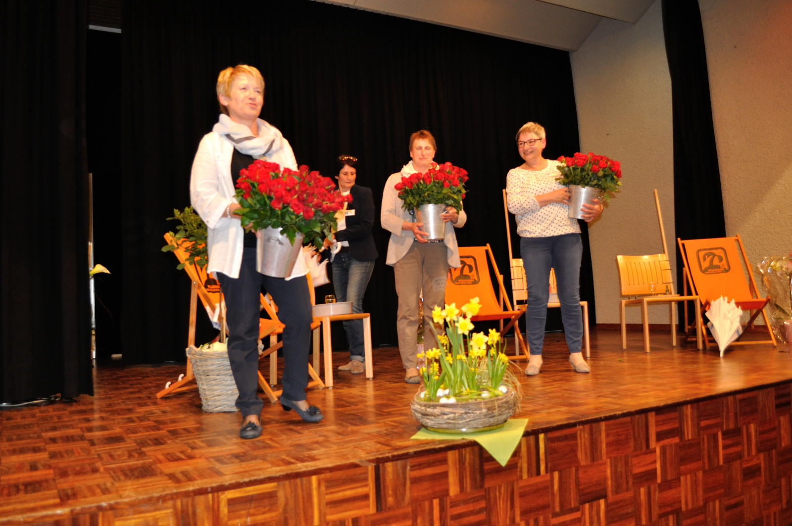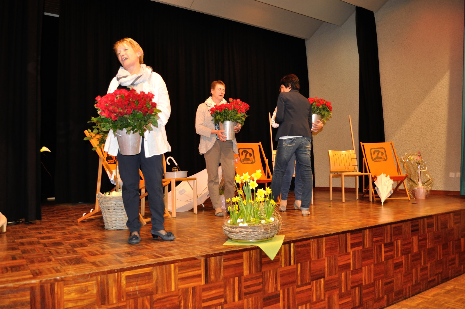 In gewohnt humorvoller Art liess die Präsidentin das Vereinsjahr Revue passieren. Nach 11 Jahren Amtszeit stellte sich die Präsidentin, Esther Schöb, nicht mehr zur Wahl. Sie blickte kurz auf die vergangenen Jahre zurück und bedankte sich bei allen Vorstandskolleginnen und Mitgliedern für die schöne Zeit. Ebenso traten die Vorstandsmitglieder Theresia Trüssel und Vreni Wick nach langjähriger Tätigkeit aus dem Vorstand zurück. Neu wurde wurde Frau Rita Christen als Präsidentin, Frau Yvette Dal Santo (Religion), Daniela Koller (Soziales) sowie Irene Appert (Kultur) gewählt. Die scheidenden Vorstandmitglieder wurden mit viel Schalk und Humor sowie einem Meer von roten Rosen in den Ruhestand verabschiedet.