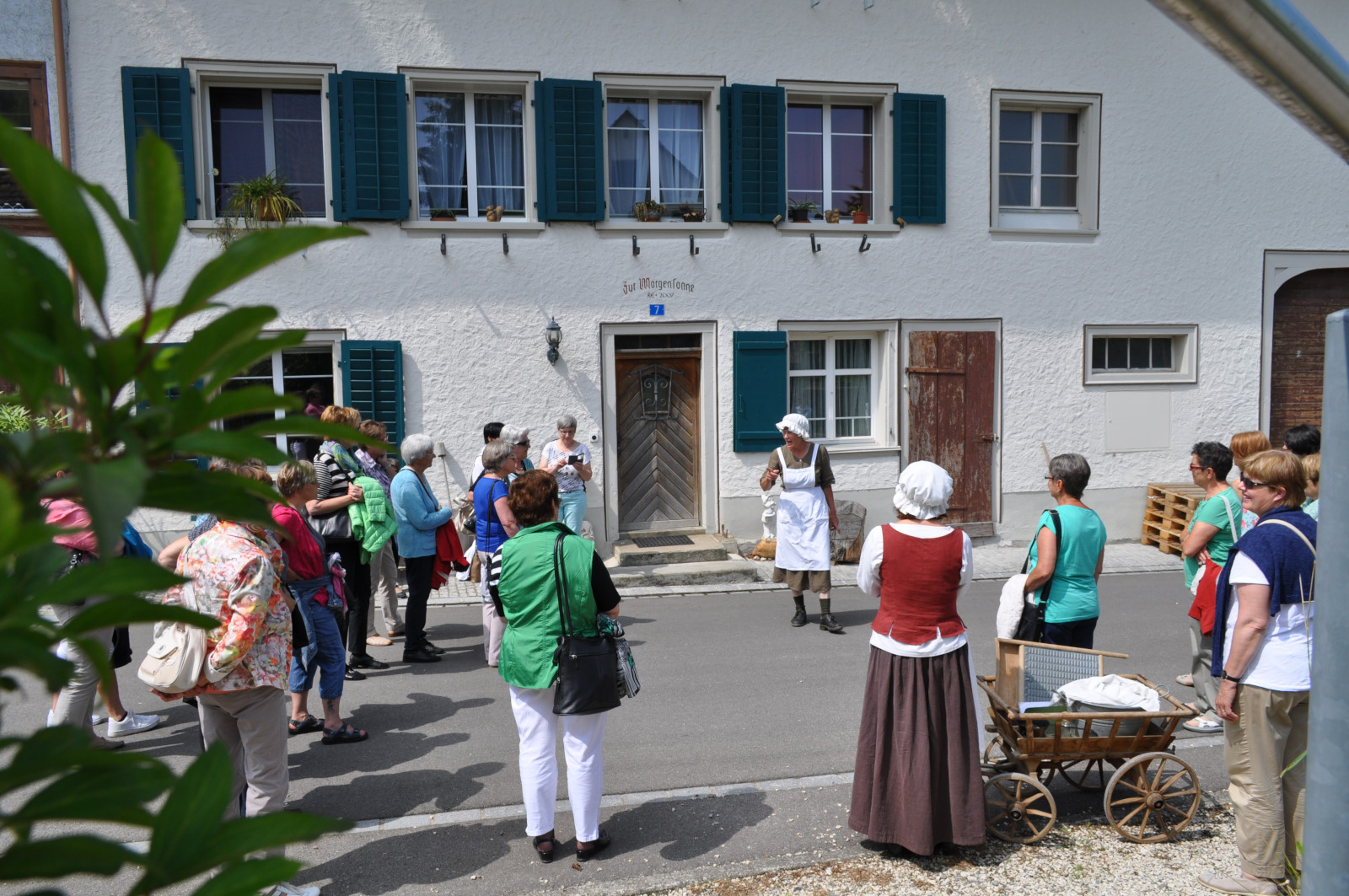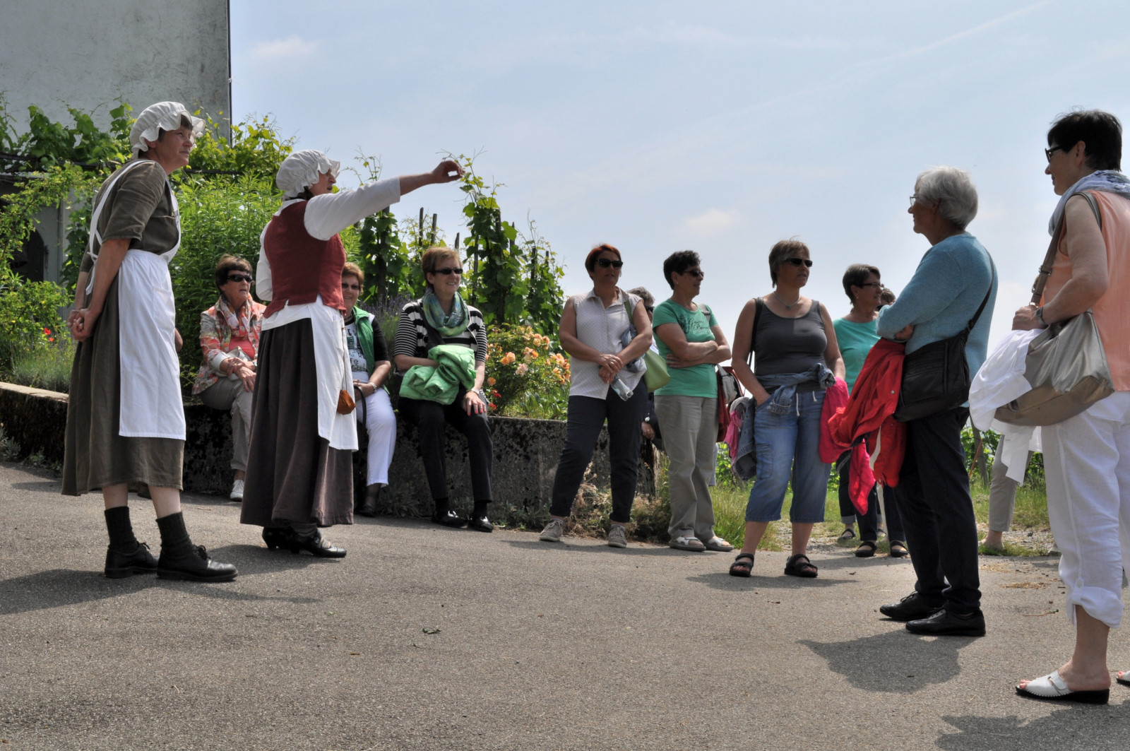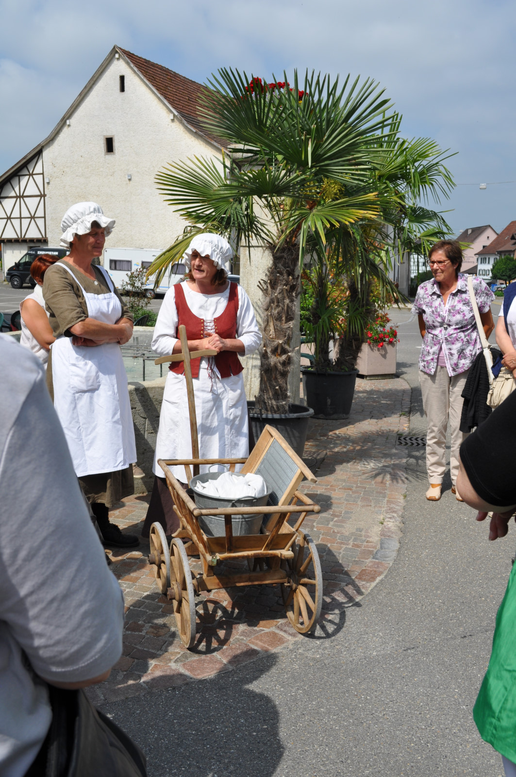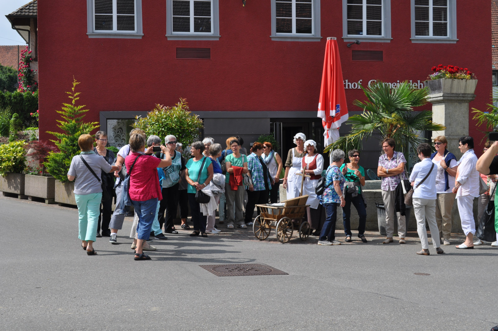 Weiter ging es dann nach Wilchingen bei strahlendem Sonnenschein. Ein wunderschönes Städtchen mit alten schmucken Häusern. Mitten im Dorf am Gemeindehausbrunnen haben wir dann ein erstes Gläschen Weisswein und dazu ein Stück noch ofenwarmes Brot genossen. Nun waren wir gestärkt für den Rundgang mit den waschechten „Wöschwiiber“ aus dem 18. Jahrhundert. Sie führten uns tratschend und klatschend durch die Dorfgeschichte. Einfach witzig und spritzig.