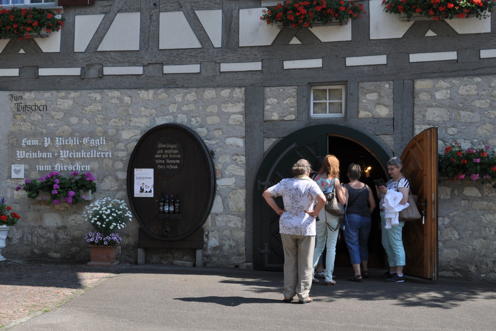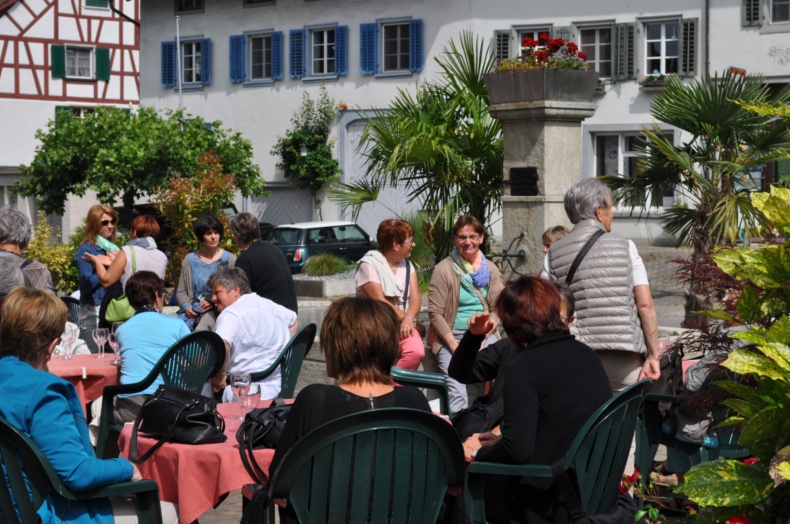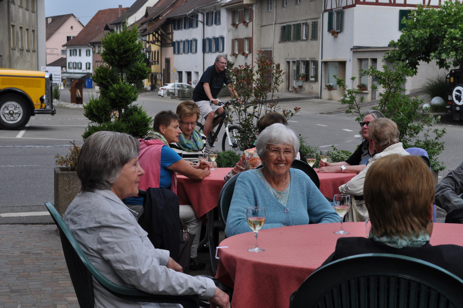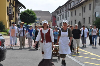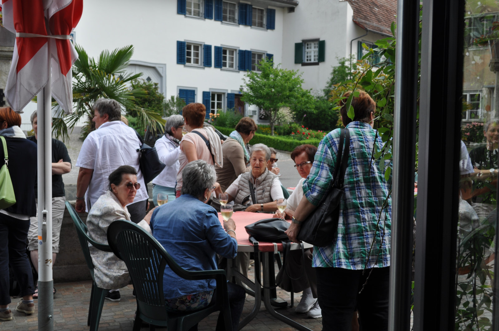 Weiter ging es dann nach Wilchingen bei strahlendem Sonnenschein. Ein wunderschönes Städtchen mit alten schmucken Häusern. Mitten im Dorf am Gemeindehausbrunnen haben wir dann ein erstes Gläschen Weisswein und dazu ein Stück noch ofenwarmes Brot genossen. Nun waren wir gestärkt für den Rundgang mit den waschechten „Wöschwiiber“ aus dem 18. Jahrhundert. Sie führten uns tratschend und klatschend durch die Dorfgeschichte. Einfach witzig und spritzig.
