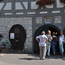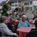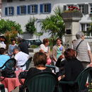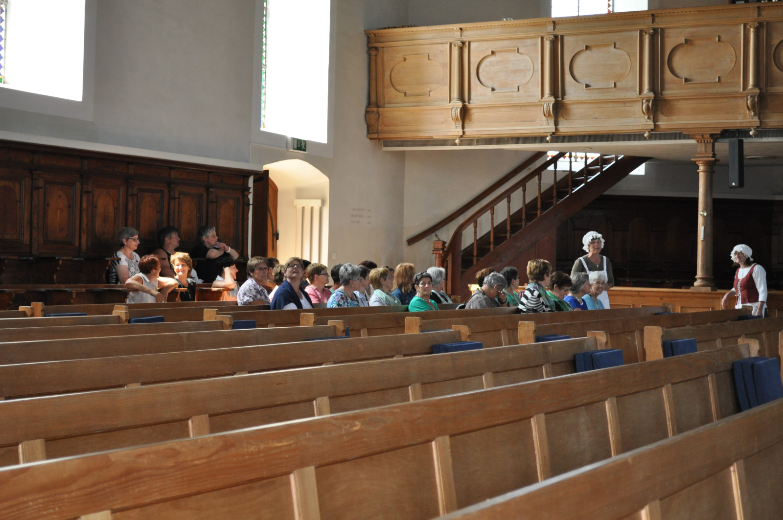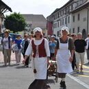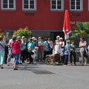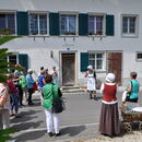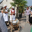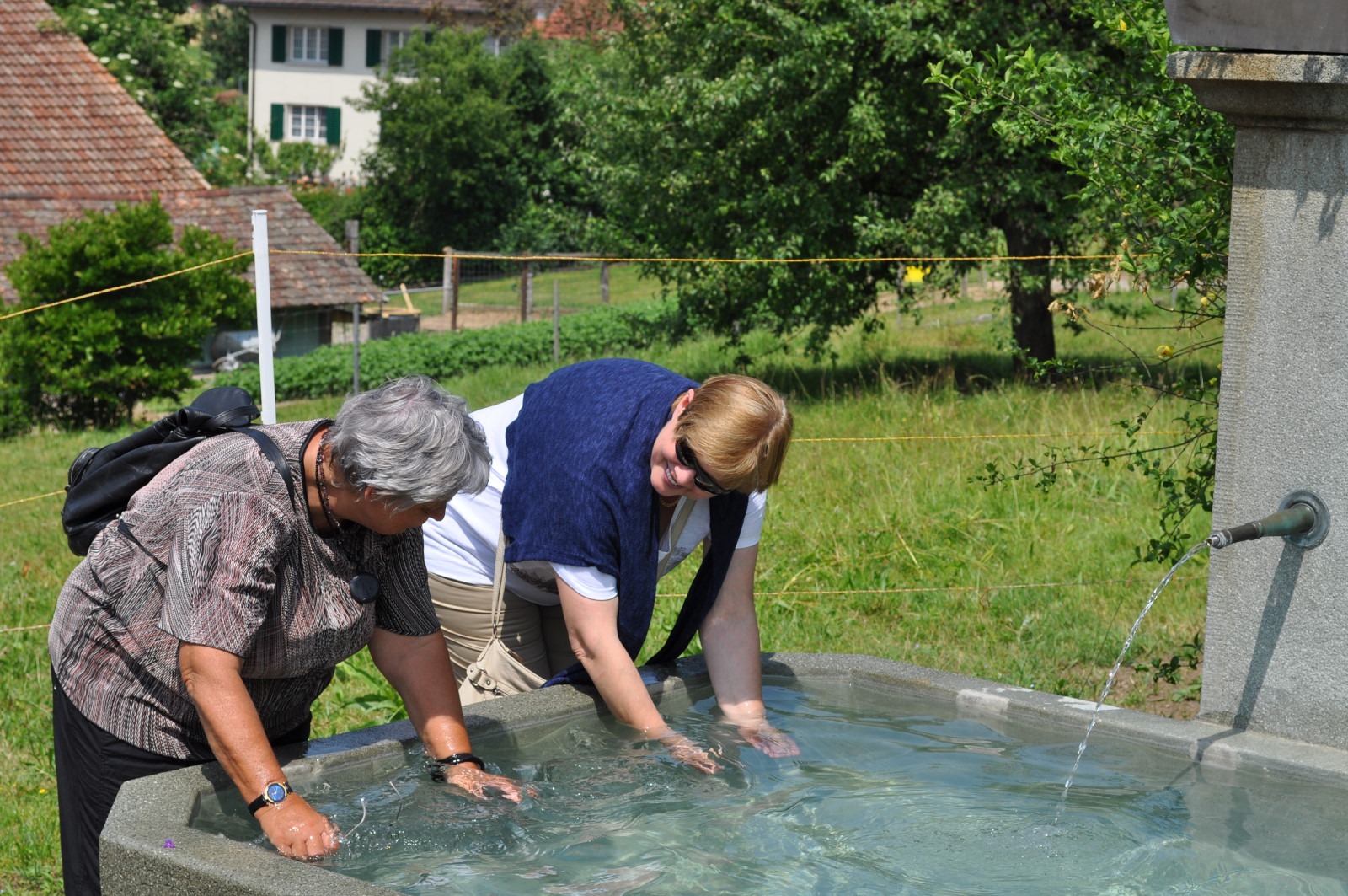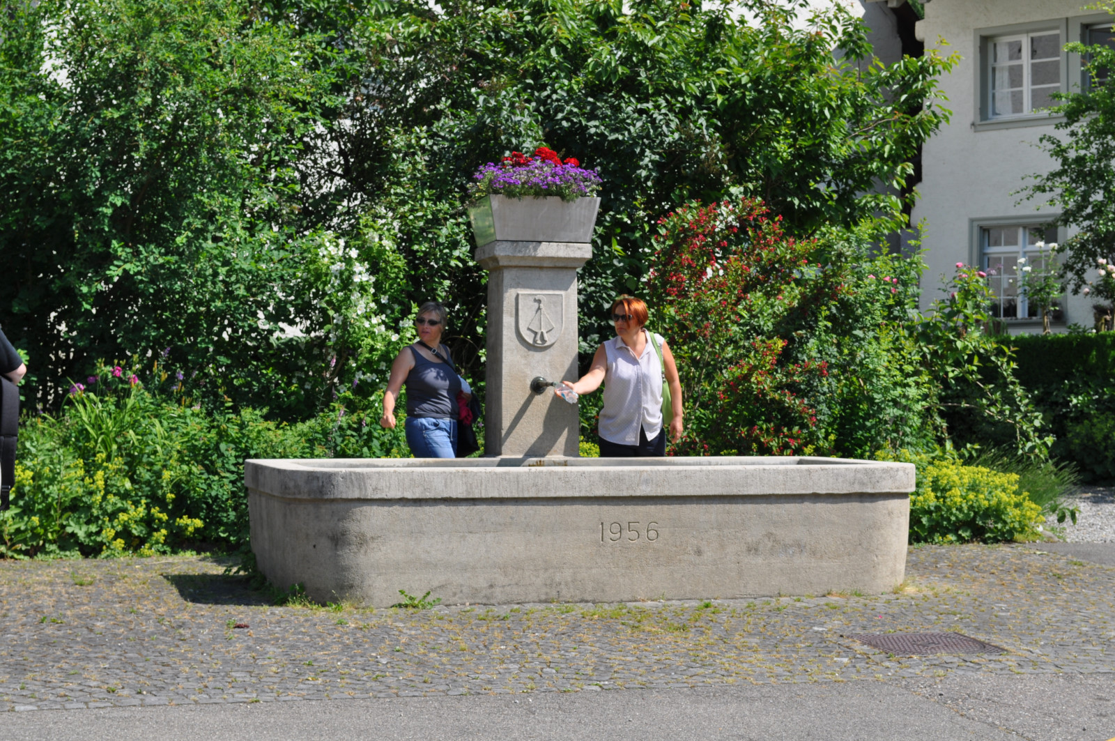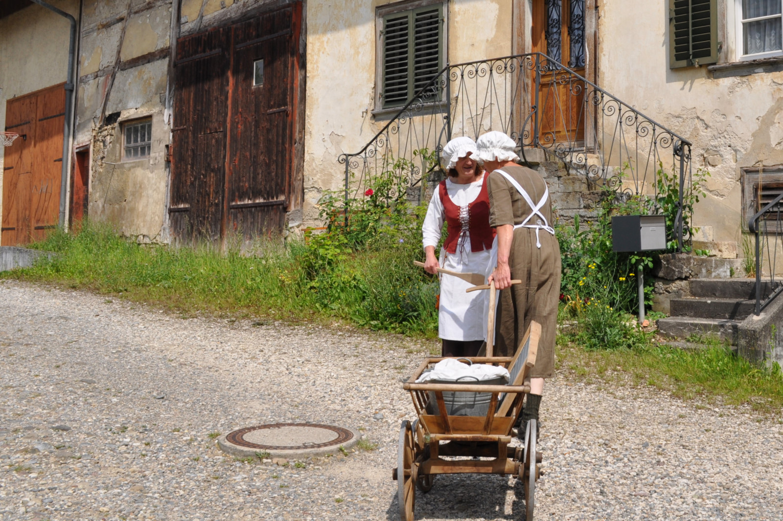 Weiter ging es dann nach Wilchingen bei strahlendem Sonnenschein. Ein wunderschönes Städtchen mit alten schmucken Häusern. Mitten im Dorf am Gemeindehausbrunnen haben wir dann ein erstes Gläschen Weisswein und dazu ein Stück noch ofenwarmes Brot genossen. Nun waren wir gestärkt für den Rundgang mit den waschechten „Wöschwiiber“ aus dem 18. Jahrhundert. Sie führten uns tratschend und klatschend durch die Dorfgeschichte. Einfach witzig und spritzig.