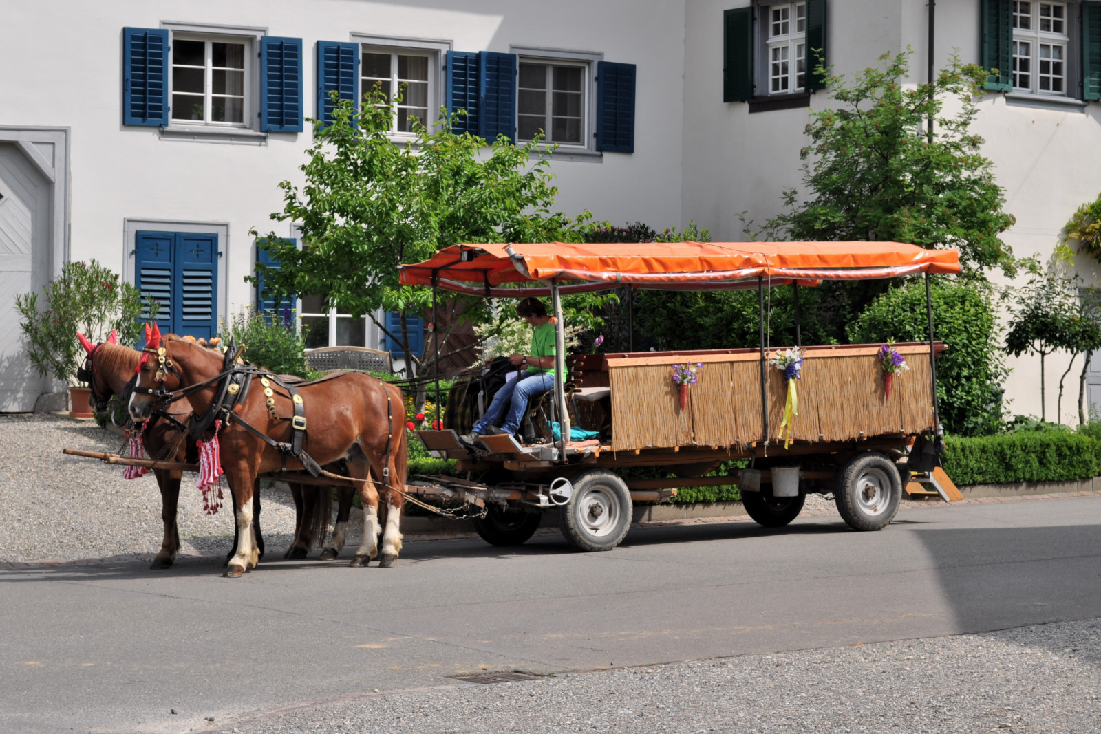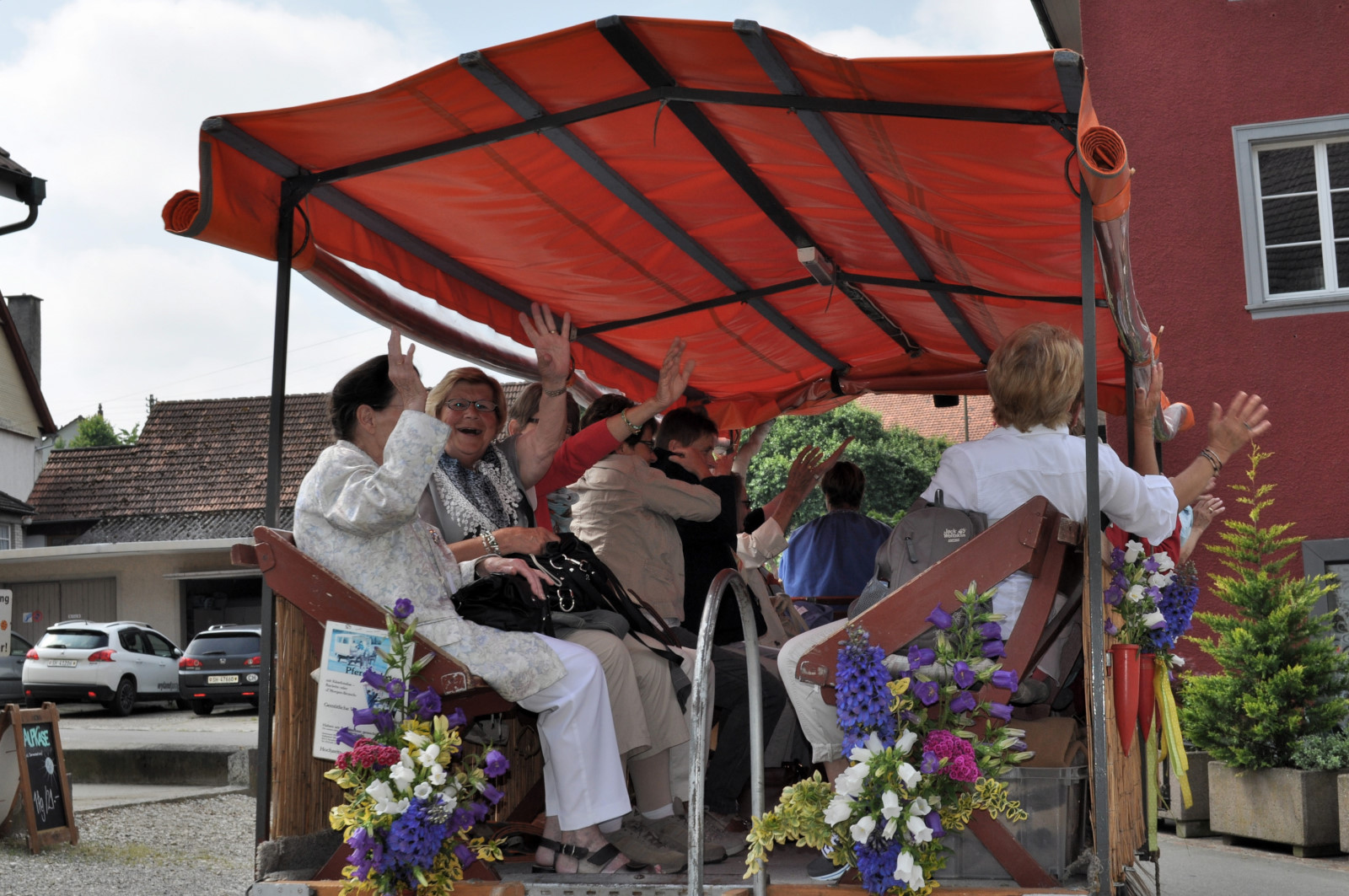Der Koch des Gemeindehauses hat uns ein einfaches, aber leckeres Essen gezaubert. Mit den vollen Bäuchen war die Rösslifahrt genau das Richtige: ruhen und die Landschaft geniessen. Inzwischen war es schon wieder richtig sommerlich warm und wir hatten alle wieder Durst und freuten uns auf die Weindegustation. Nun hiess es nur noch in den Car steigen und uns gemütlich nach Gossau chauffieren zu lassen.