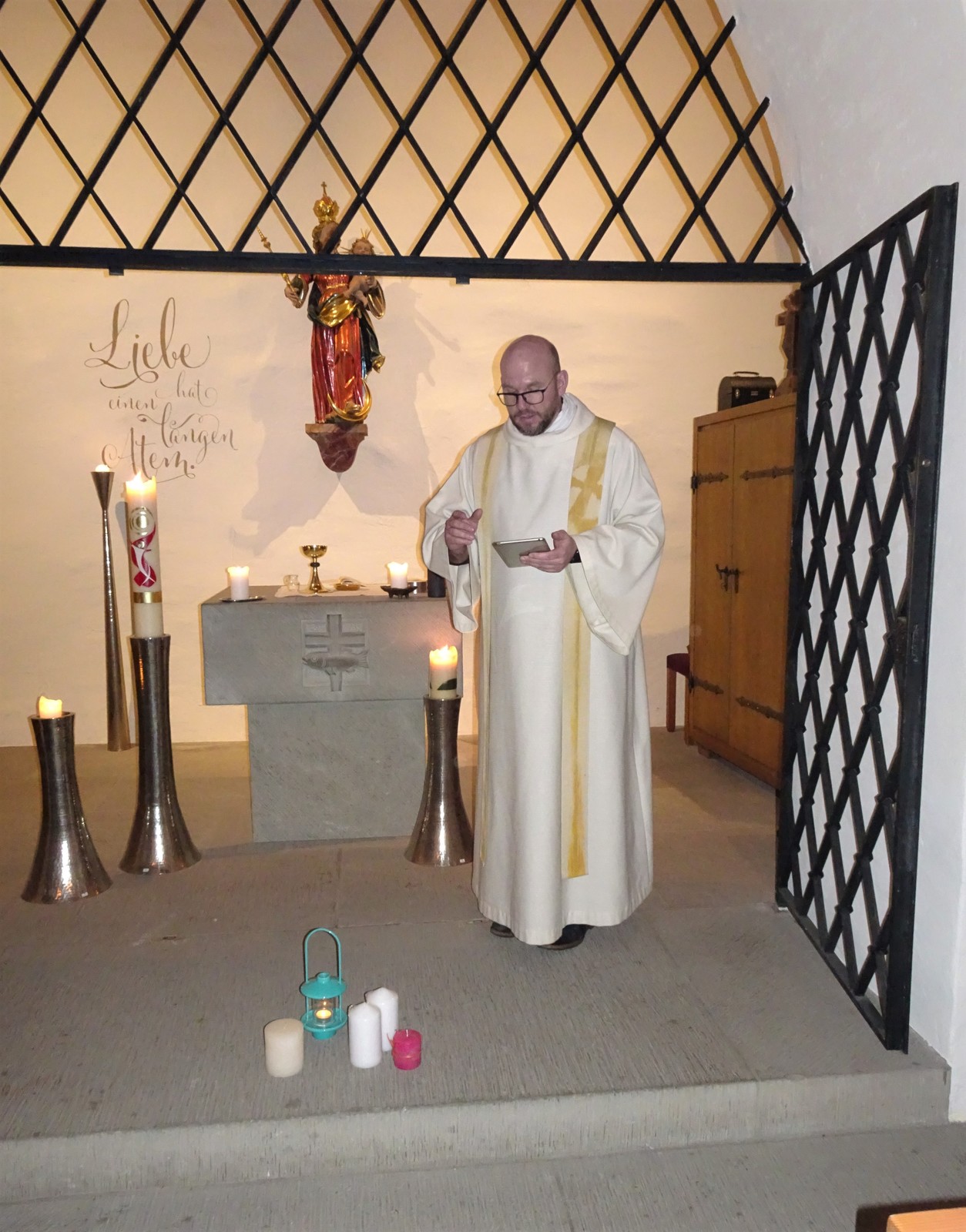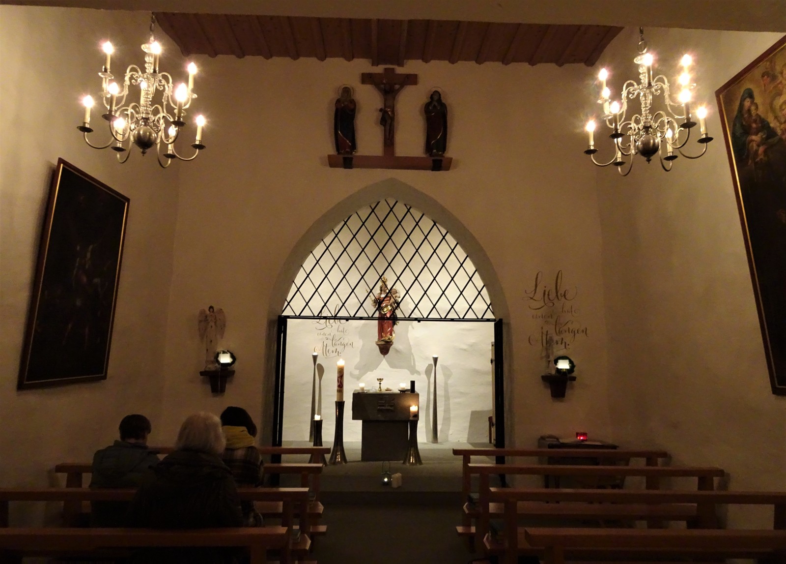 Der vertraute Blick auf das beleuchtete Schloss Oberberg erfreute schon von Weitem. Oben angekommen hörte man feine Klavierklänge aus der Schlosskapelle. Pater Andy Givel erwartete die Frauen und feierte Gottesdienst mit ihnen. Dabei weihte er die mitgebrachten Kerzen. Anschliessend offerierte die Frauengemeinschaft Andreas einen Umtrunk im heimeligen Dokumentenzimmer des Schlosses. Ein Anlass in kleinem Rahmen, jedoch sehr gemütlich.
