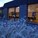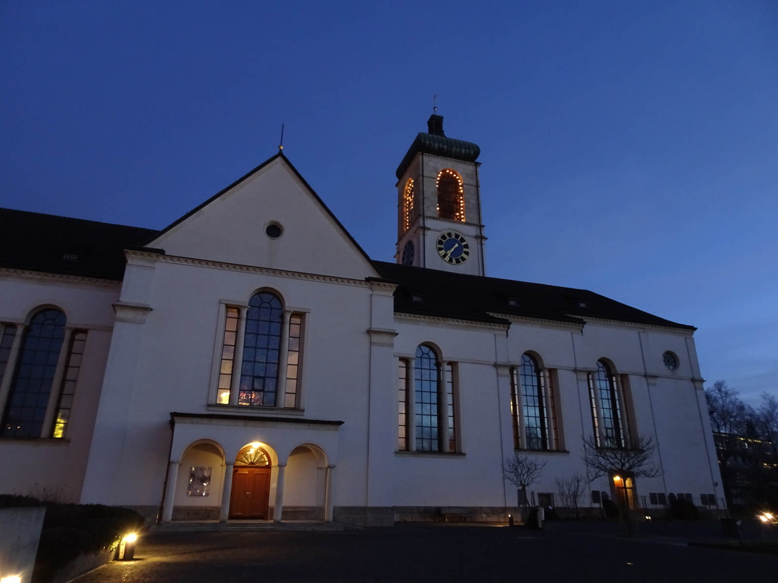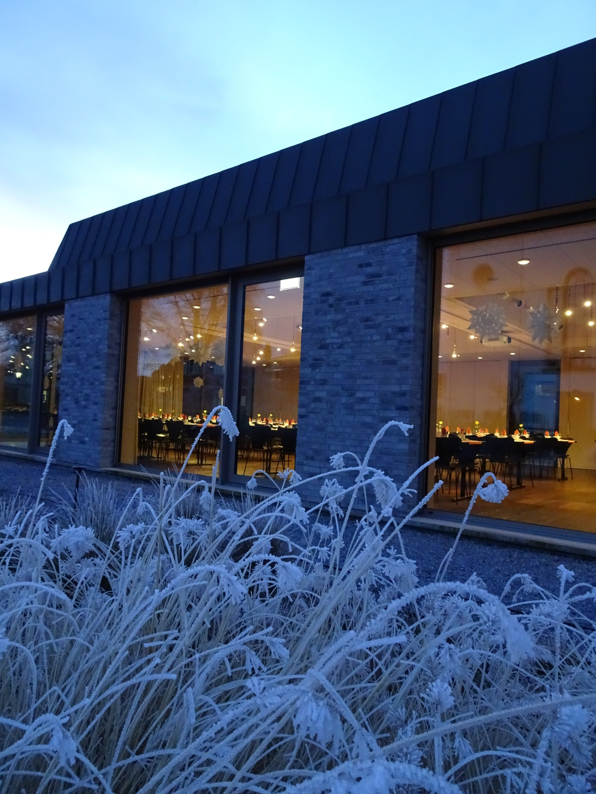Ganz verzaubert lag der Bibelgarten da an diesem Morgen, in einem weissen Kleid aus Raureif. Der hell erleuchtete Andreas-Saal nebenan zog ebenfalls Blicke auf sich